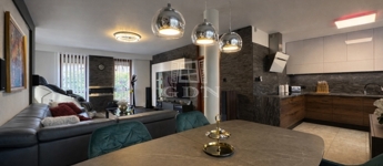 A belső terek tágasak és világosak, fa díszítőelemekkel, egyedi tervezésű bútorokkal és hangulatvilágítással, amelyek igényes, esztétikus összhatást teremtenek.