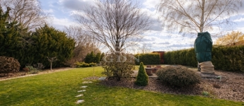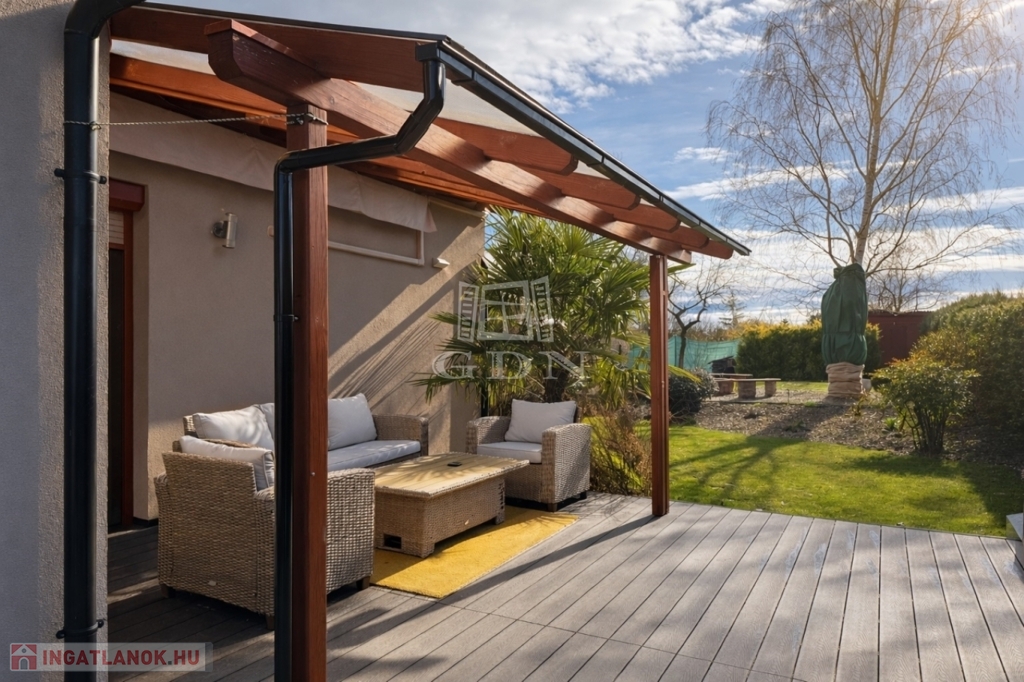 A telek 860 m² nagyságú, parkosított, rendezett és teljes mértékben elkülönített használatú. A kert öntözését ásott kút, valamint almérős locsolórendszer biztosítja. A garázs előtti terület térburkolattal ellátott, amely több gépjármű parkolására alkalmas.