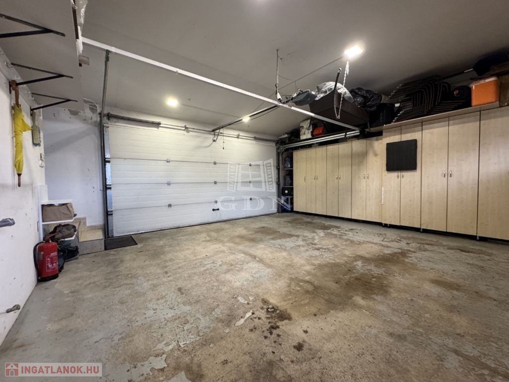 A lakóépülethez közvetlenül kapcsolódik egy 36 m² alapterületű, fűtött, kétállásos gépkocsitároló, amely az előszobából megközelíthető.