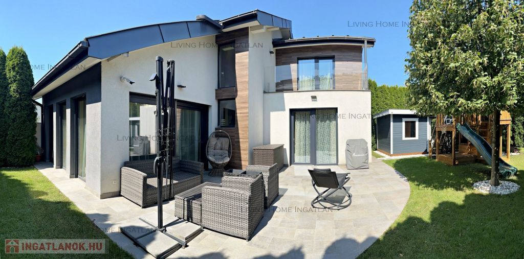Panorámaliget is a modern new residential complex in Üröm, located near Budapest, at the foot of the mountains and offering beautiful panoramic views of the surrounding countryside. The semi-detached house is located in a quiet dead-end with no through traffic. The property has the feel of a completely detached family house, as the living area and the garden are completely separated, the common wall is double and soundproofed. The plot of 435 sqm is surrounded by ornamental trees, beautifully landscaped, and the irrigation is provided by an automatic irrigation system. Small children can play on the wooden playground with a slide and climbing frame in the middle of the garden, while adults can enjoy the 4-person sauna in a separate building or the jacuzzi on the terrace. Even larger groups can be comfortably accommodated in the seating area on the terrace. Through an automatic garage door, the garden can comfortably accommodate two vehicles in the paved, paved parking area.