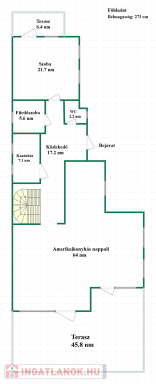 A középső szinten egy tágas amerikai konyhás nappali egy előszoba, mosókonyha, hálószoba, fürdőszoba és egy külön WC kapott helyet.