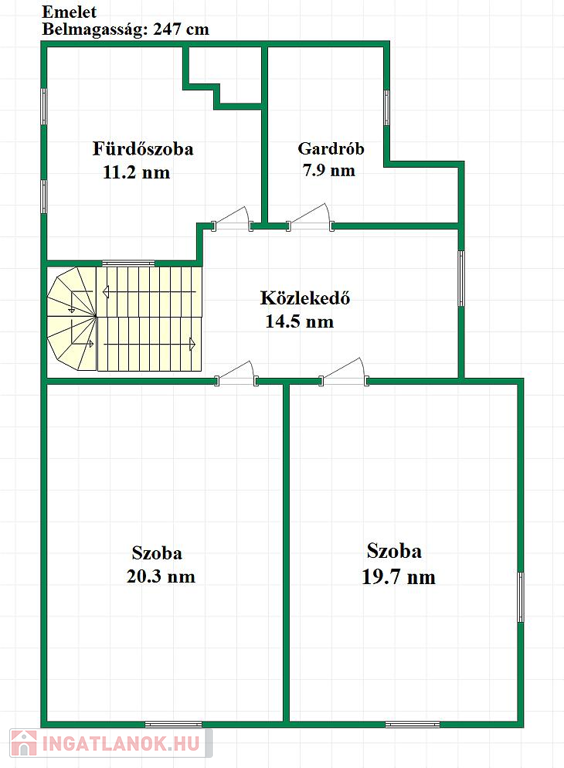 Az emeleten egy előtér, 2 hálószoba egy gardróbszoba és egy fürdőszoba került kialakításra.