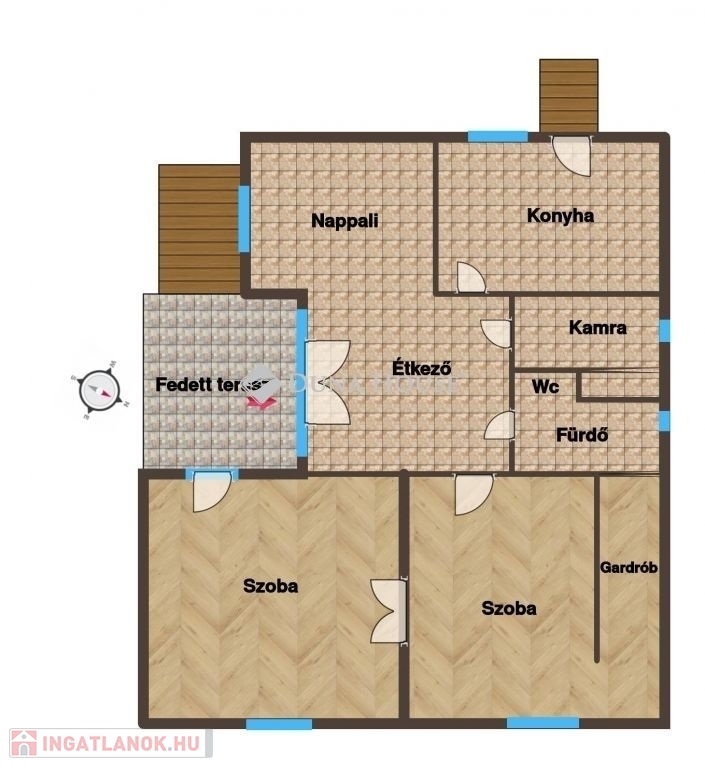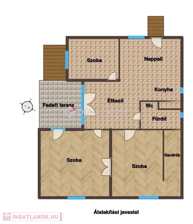Jelenlegi elrendezéssel nappali-konyha-étkező+2 szobás ingatlan könnyen 3 szobássá is alakítható.