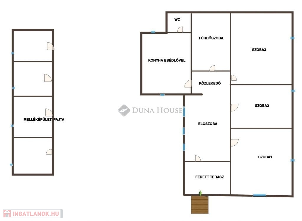 Jobbra 3 szoba nyílik a közlekedőről (az utolsó kettő sérült: beomlott vályogfal, gyenge mennyezet)