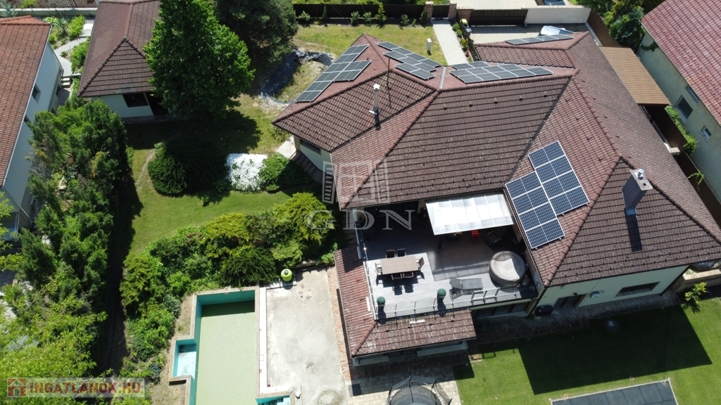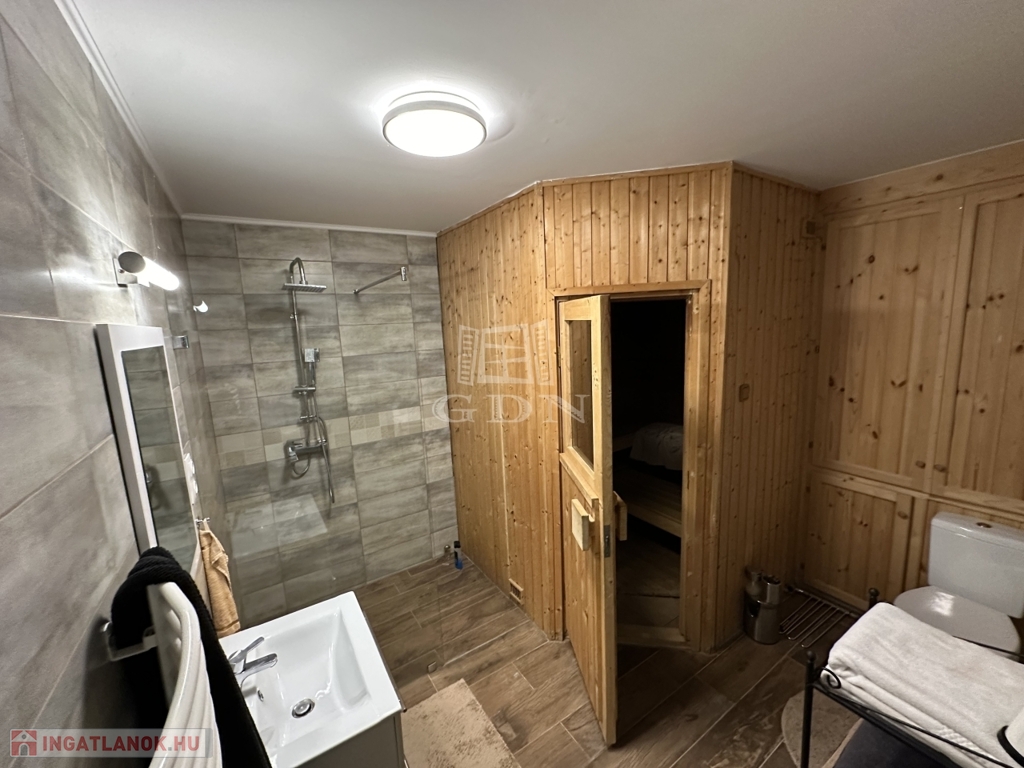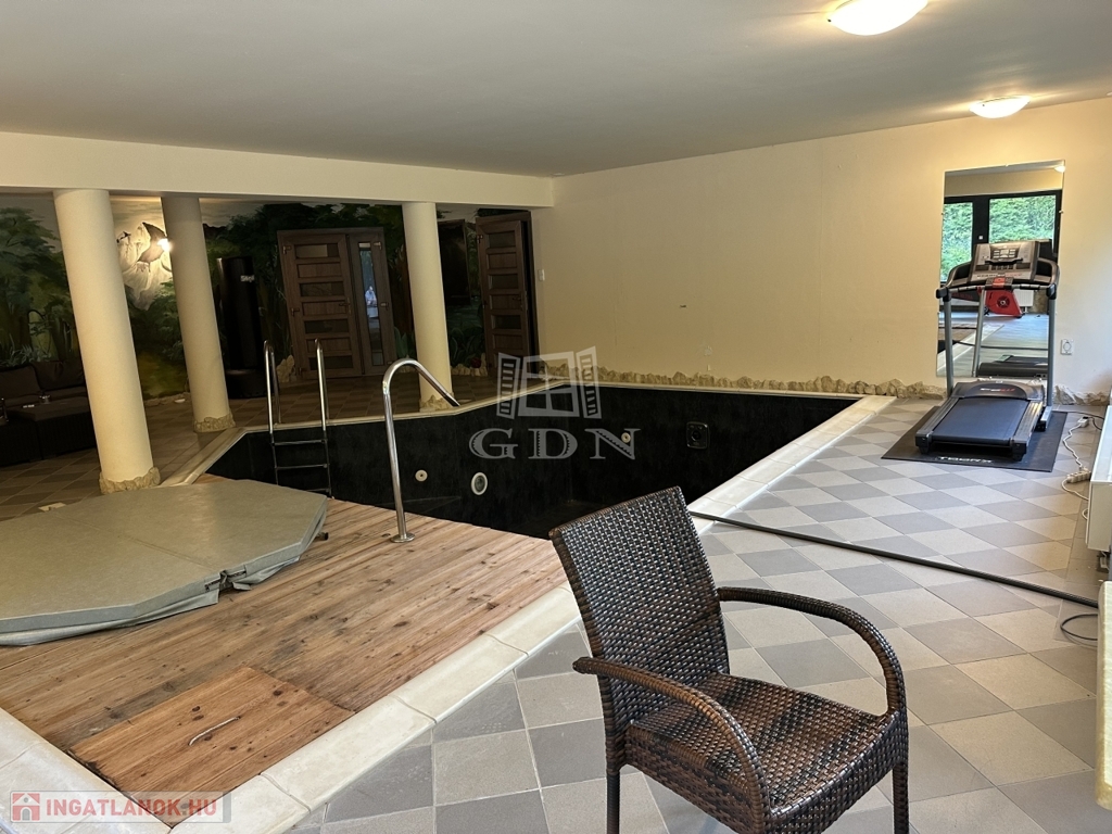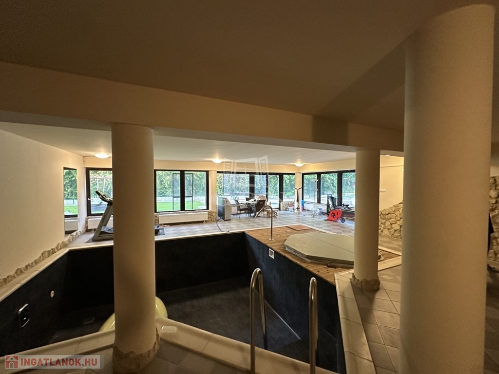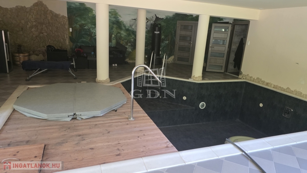 Az igazi kikapcsolódást az alsó szinten található WELLNESS RÉSZLEG teszi teljessé, ahonnan a hatalmas nyílászáróknak köszönhetően remek kilátás nyílik a kertre. A 9x4 méteres medence és a mellette található jakuzzi hőszivattyús fűtéssel rendelkezik. Külön helyiségben található a szauna, és a zuhanyzó. Ugyanezen a szinten a 2 hálószoba mellett kialakításra került egy tároló, valamint egy tágas háztartási helyiség is.