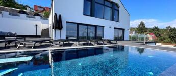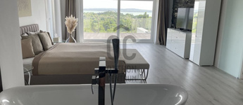 Lélegzetelállító panoráma, tágas terek és modern elegancia – ezek a jellemzők határozzák meg ezt a kivételes, újszerű, örök balatoni panorámás villát.