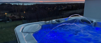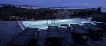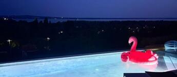 Von der 150 m² großen, sonnigen Terrasse eröffnet sich ein unvergleichlicher Blick auf den Balaton, den man auch aus dem beheizbaren Infinity-Pool genießen kann – der perfekte Ort zum Entspannen oder für gesellige Stunden mit Familie und Freunden.