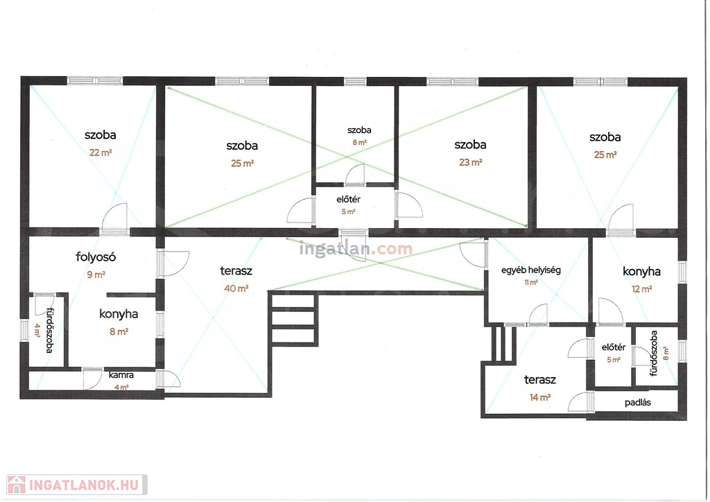 - jelenlegi elosztás: 6 szoba, 2 konyha, 2 fürdőszoba, kamra.
