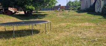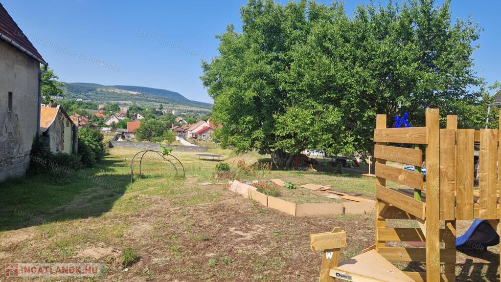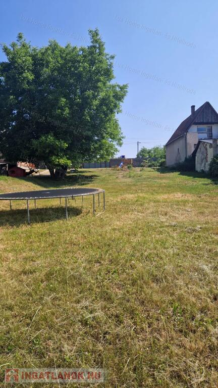 Enyhén lejtős, szépen gondozott telek, 20 méter széles és három oldalról bekerített.