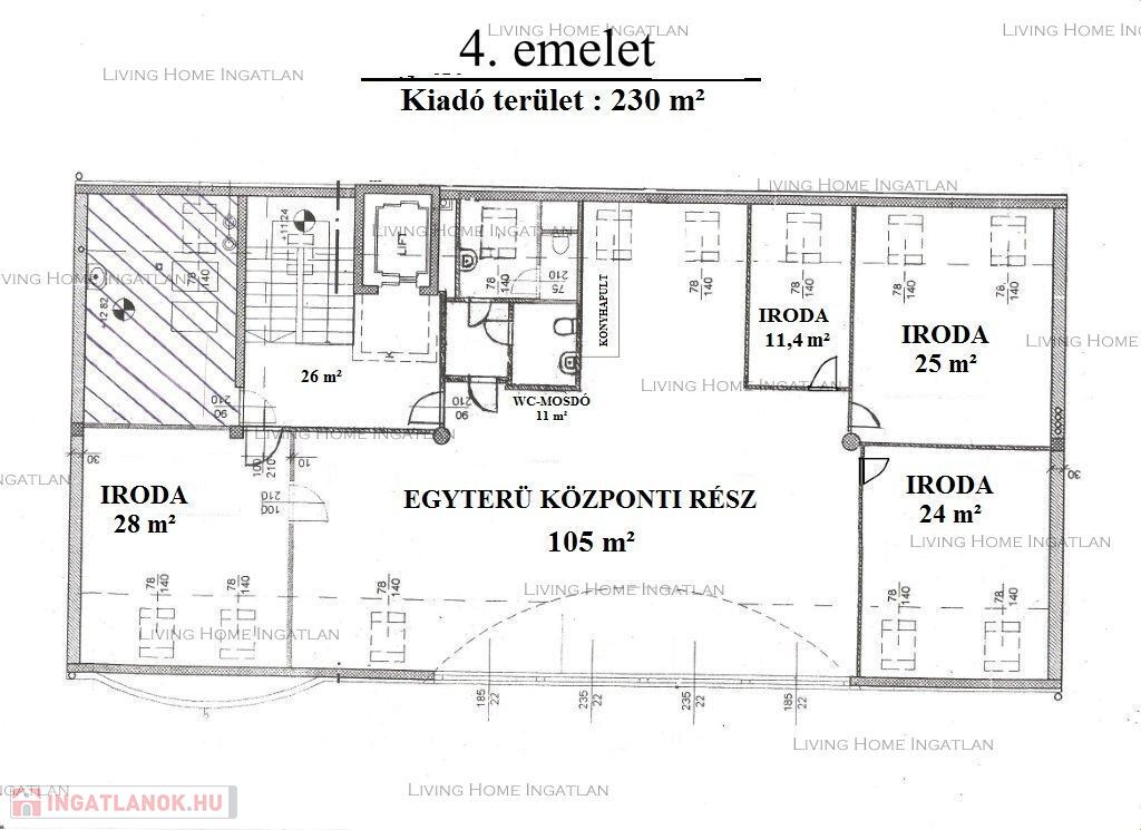 XIII. A fourth-floor, 200 m2 office space for long-term rent in Angyalföld. Available to move in IMMEDIATELY! Rental fee: 7 EUR/m2/month + VAT Operating fee: 2.0 EUR/m2/month + VAT Utilities: 4 EUR/m2/month + VAT The price of our rental parking lots is HUF 20,000/pc/month + VAT can also be paid in HUF, which amount is invoiced at the daily exchange rate. The operating fee includes the following: · Garbage delivery fee · Elevator maintenance · Green area maintenance · Boiler maintenance · Chimney maintenance · Toilet and gutter maintenance · Camera and access control system maintenance · Alarm system maintenance · Street lighting · Air conditioning maintenance fee · Snow removal from the roads · Technical service <br /> Visiting the offices is possible during working hours. The floor plan and data are informative. English: XIII. in Angyalföld for long term rent a 200 sqm office space on the fourth floor. Available for immediate move! Rental fee: 7 EUR/sqm/month + VAT Operating fee: 2.0 EUR/sqm/month + VAT<br /> Overhead: 4 EUR/sqm/month + VAT Parking for rent HUF 20,000/piece/month + VAT<br /> The fees are payable in HUF, which is the daily exchange rate. The operating fee includes the following: - Garbage collection fee - Lift maintenance - Maintenance of green area - Boiler maintenance - Chimney maintenance - Washroom and drain maintenance - Camera and access control system maintenance - Alarm system maintenance - Street lighting - Air conditioning maintenance charges - Snow clearance from access roads - Technical assistance <br /> The offices can be visited during working hours. Floor plan and data are for information only.