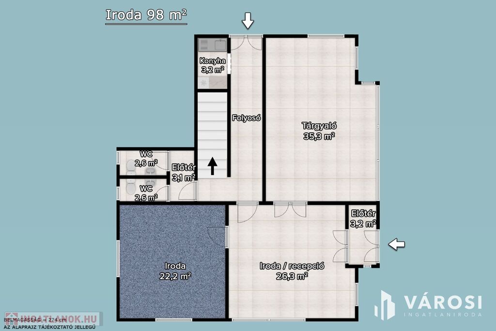 Az iroda önálló bejárattal rendelkezik 0-24 használható, önálló riasztóval felszerelt.