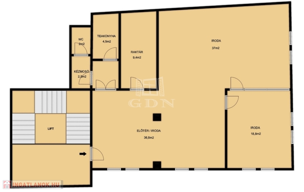Elosztását tekintve eredetileg egy előtérből, három különálló irodából, egy kisebb raktárból, valamint konyha-étkezőből és mellékhelyiségből állt. Jelenleg két tágas, világos, egybenyitott irodatér és egy külön irodahelyiség alkotja.