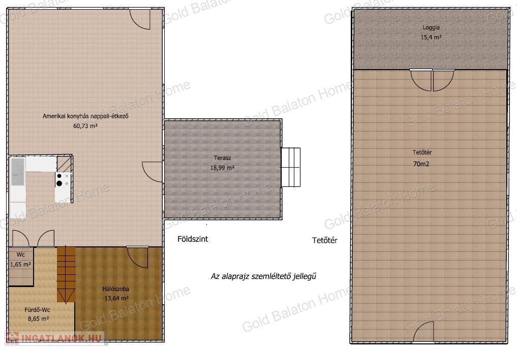 Üdülőház / főépület: földszint 85 m² + terasz, tetőtér 70 m² + loggia
