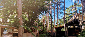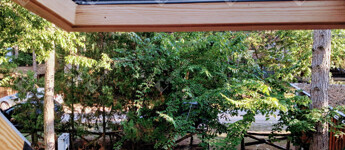 A terasz előtti fenyőfákon mókusok ugrálnak