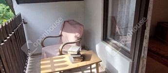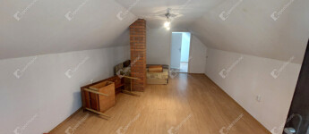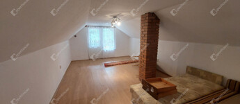 Emelet: egybenyitott, de könnyen két szobára osztható helyiség + nagy erkély.